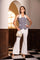 Bottom: High-waisted, white, flared trousers for a streamlined silhouette