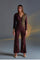 DETAIL- Brown colour v neck jumpsuit that has flared bottom and full sleeves. Chain detailings at right side of chest and left sleeves, padded and back zipper.