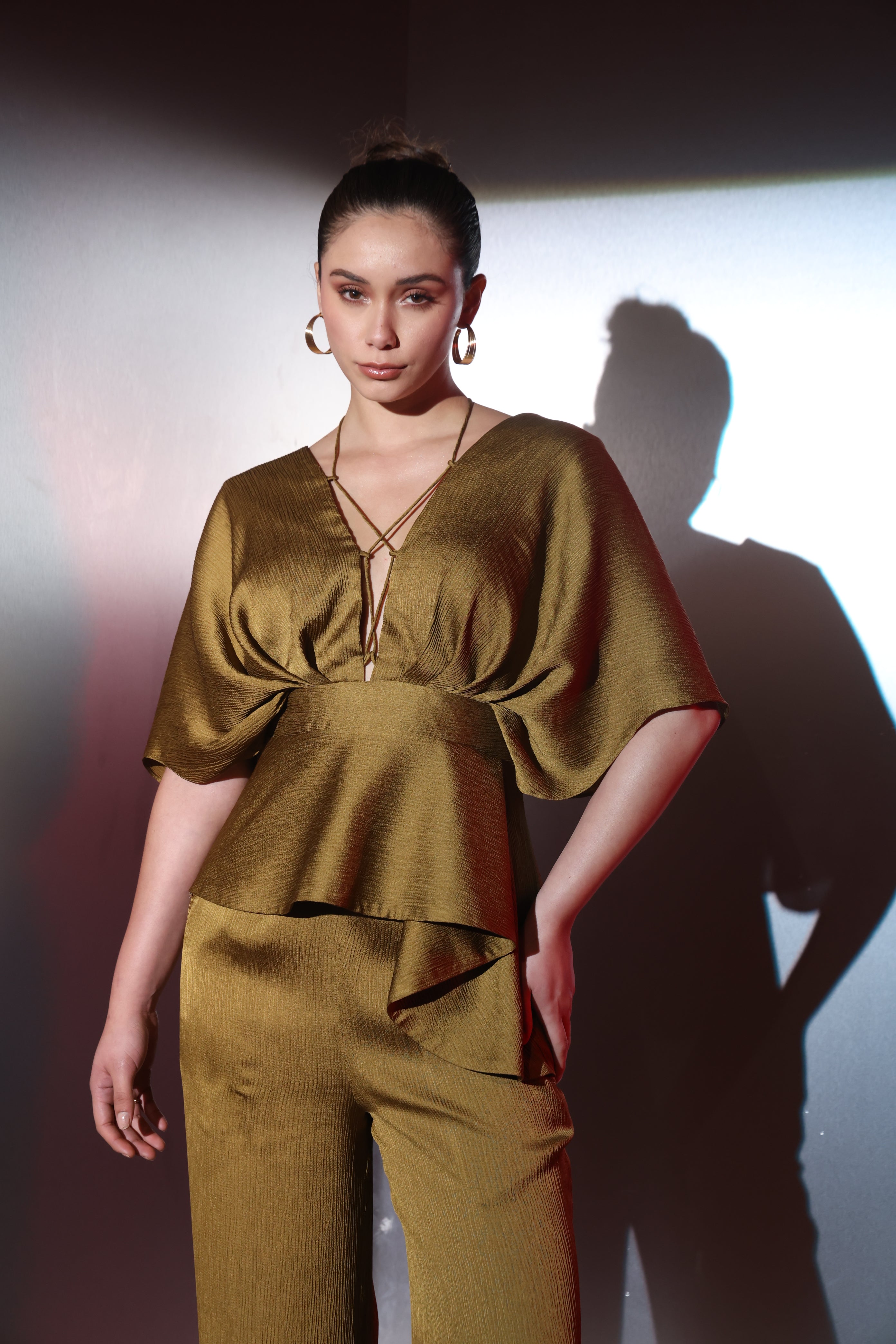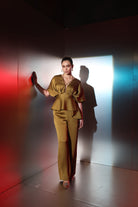 Crafted in a luxe, fluid fabric with a subtle sheen, this ensemble features a statement draped top with a flattering V-neckline and delicate strap detailing that adds a modern edge. The cinched waist flows into a soft peplum hem, creating a beautifully structured yet feminine silhouette.