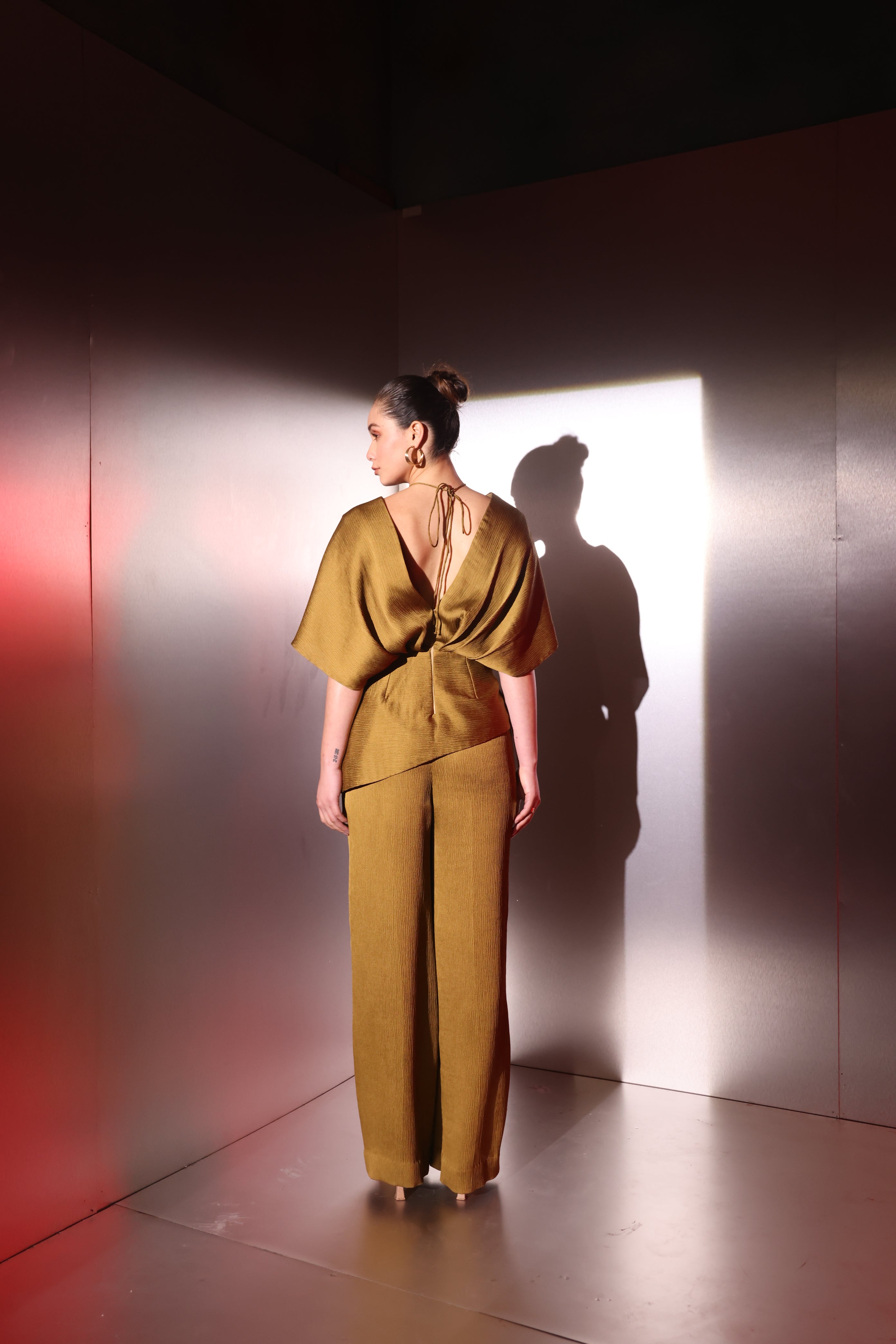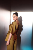 Paired with tailored straight-fit trousers, the look is polished, elongating, and perfect for both cocktail evenings and festive gatherings. The rich earthy tone enhances all skin tones, making it a timeless addition to your occasionwear collection.