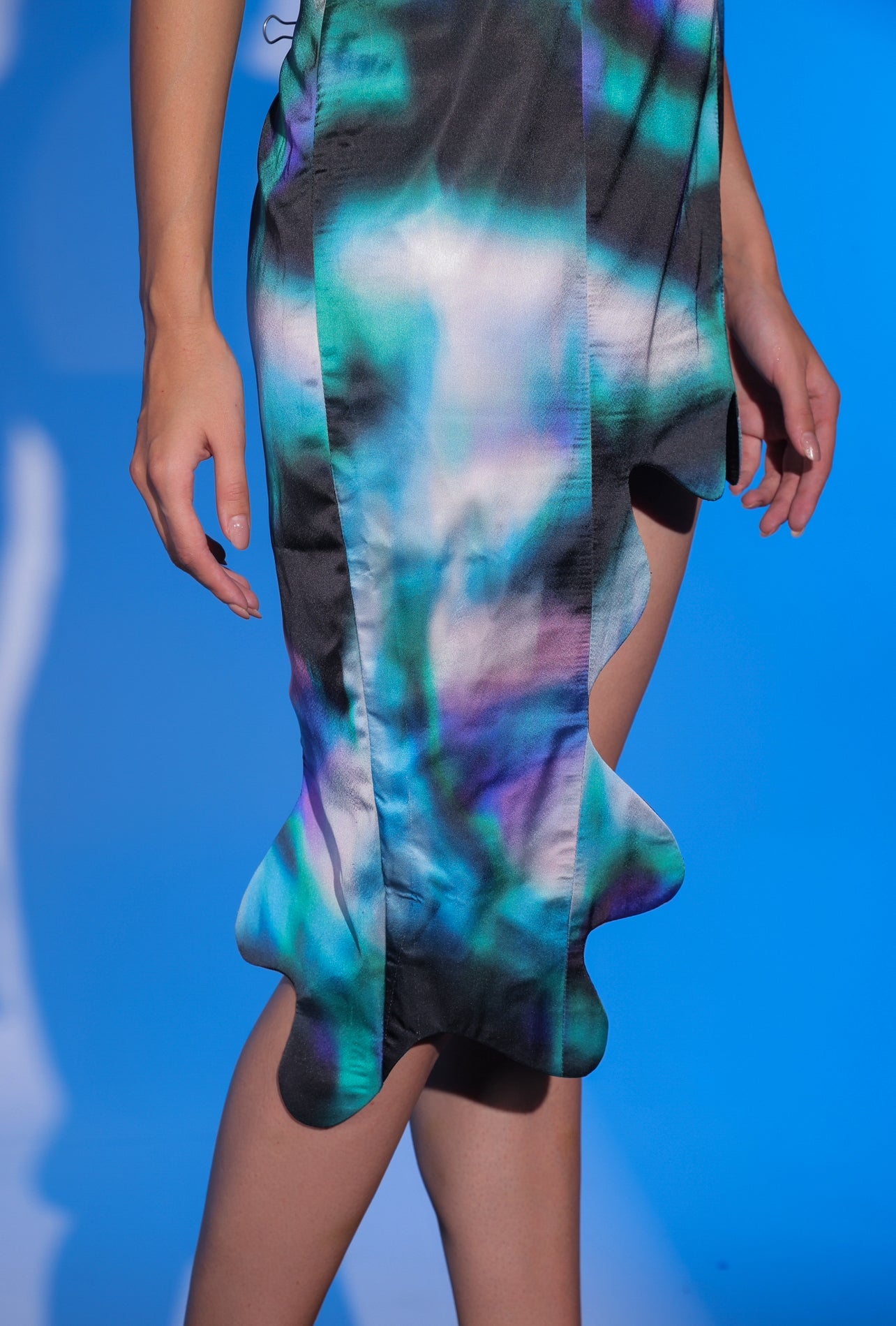 DETAIL- one shoulder fitted asymmetrical dress with waved endings. Padded and side zip.