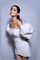 DETAIL- White off-shoulder dress with detachable statement sleeves. Heavy Ruching on the front and plain back. Padded and back zip