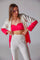 DETAIL- Dual colour blazer paired with dual colour bell bottoms and a sweetheart neckline bustier, non padded with hooked back in bustier. Side zip in pants.