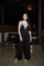 DETAIL- Full length padded jumpsuit with rhinestone detailing all over the solid V-cut tube neckline. Back zip