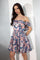 DETAIL- printed off shoulder short dress with flared bottom. Padded and back zip.