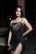 DETAIL- Fitted short dress with a slit and half lace front, rhinestone straps and outer detailings. Padded and back zip