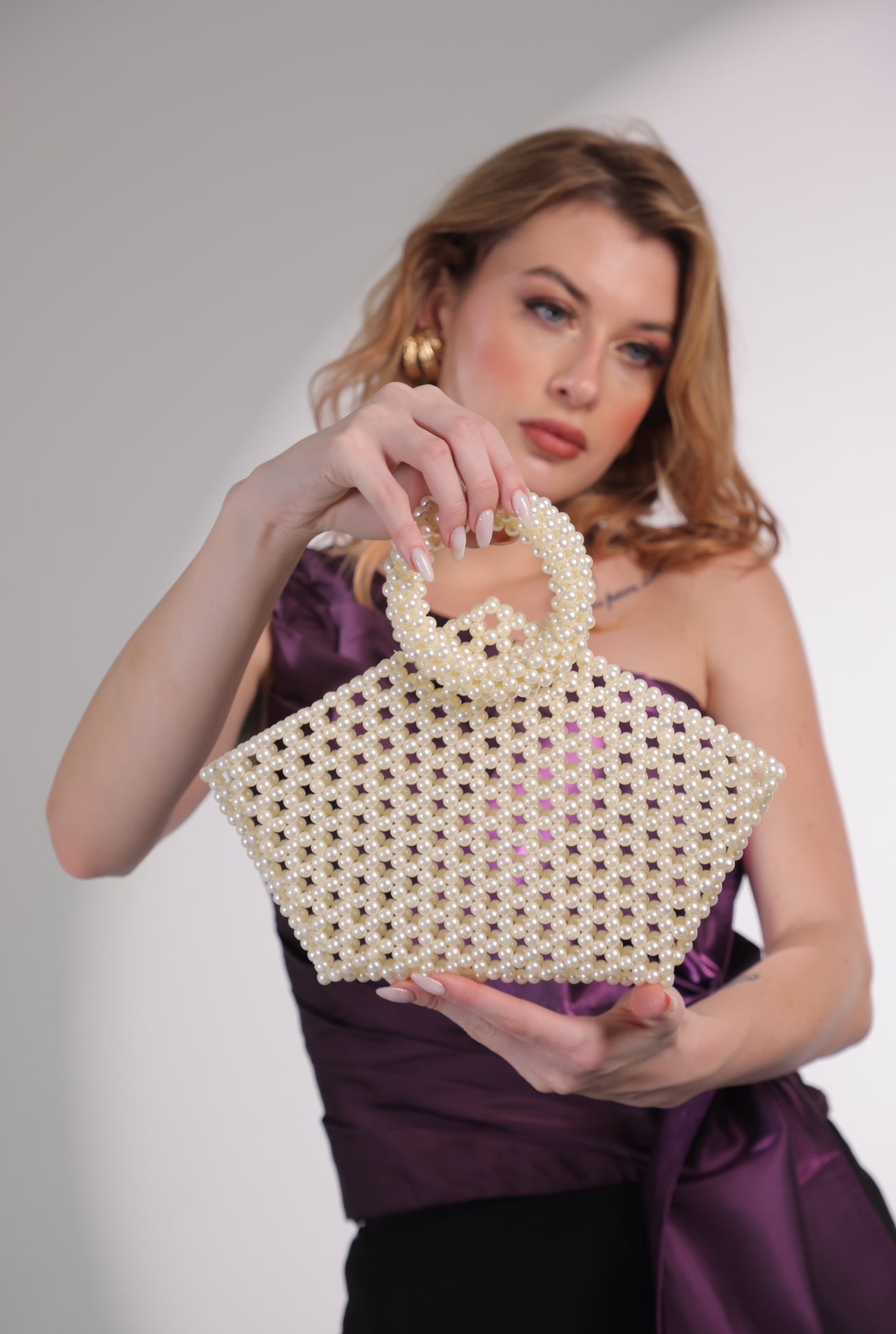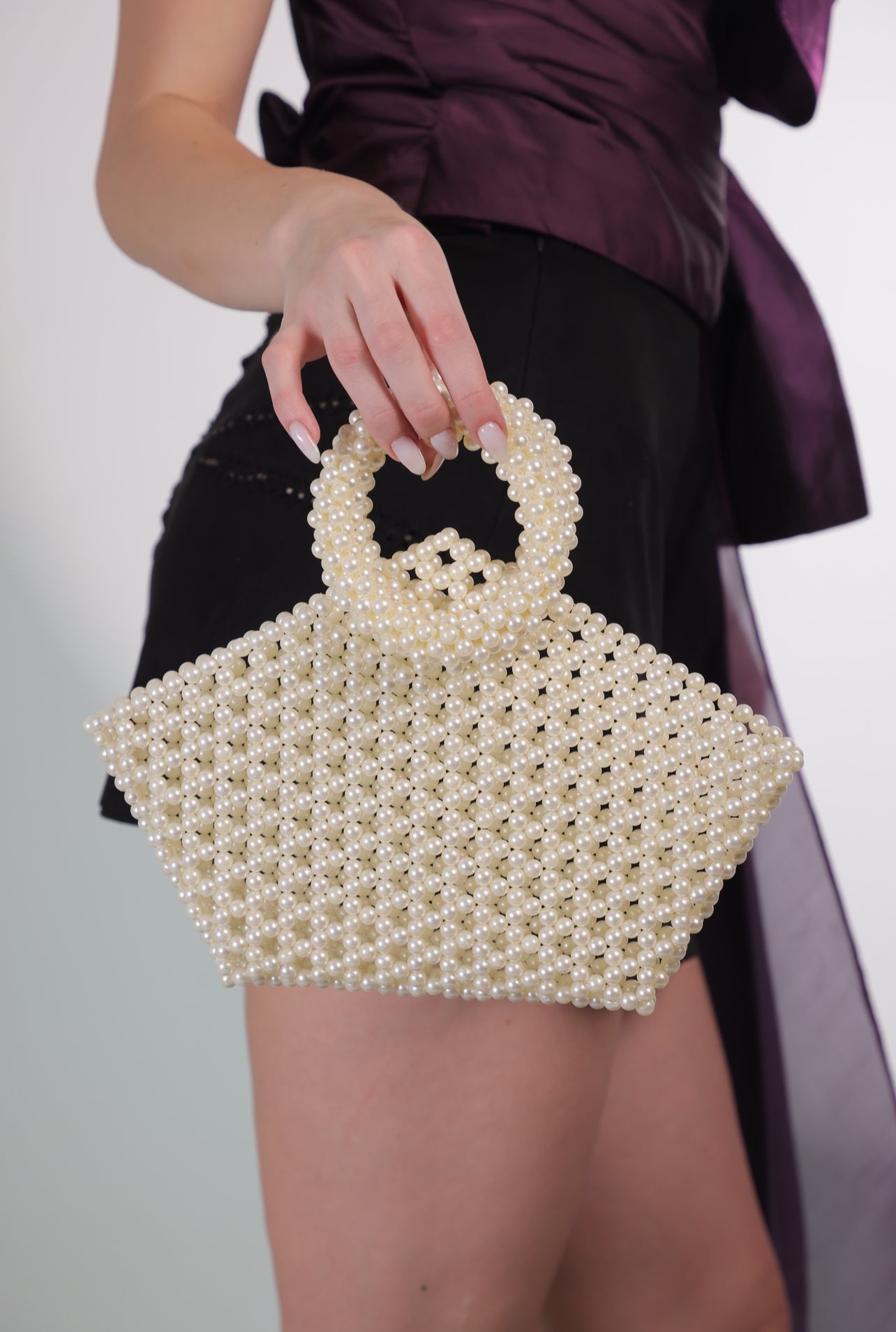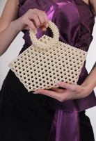 Details- Crafted with hand-selected off-white pearls, this bag is the perfect statement piece for any occasion, having ample space to fit your essentials. No closure.