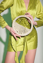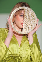 Details- Crafted with hand-selected off-white pearls, this round shaped bag is the perfect statement piece for any occasion, having ample space to fit your tiny essentials. No closure.