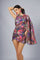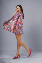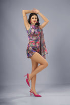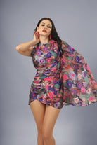 DETAIL- Pleated short dress with a cape sleeves and cutout bottom. Non padded and back zip