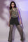 DETAIL- Black rhinestone net pants paired with green rhinestone net halter neck cowl top.