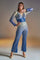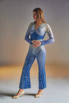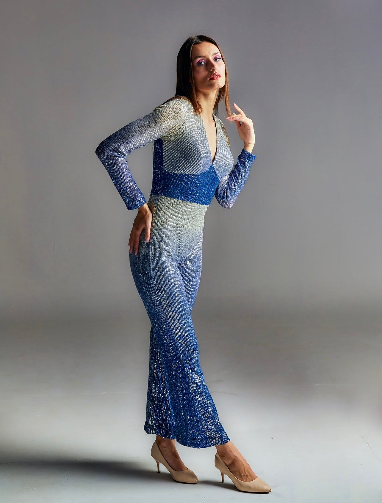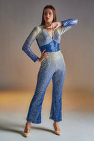 DETAIL- V neck ombre sequin jumpsuit with flared bottom and full sleeves. Padded and back zipper.