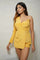 DETAIL- Mustard half blazer half tube romper with a dummy pocket and shoulder pad detailing. Padded and side zipper.