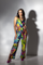 DETAIL- Satin print knotted flared leg jumpsuit with halter tie. Non padded and back zip.