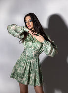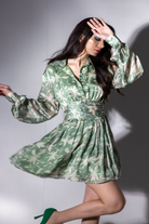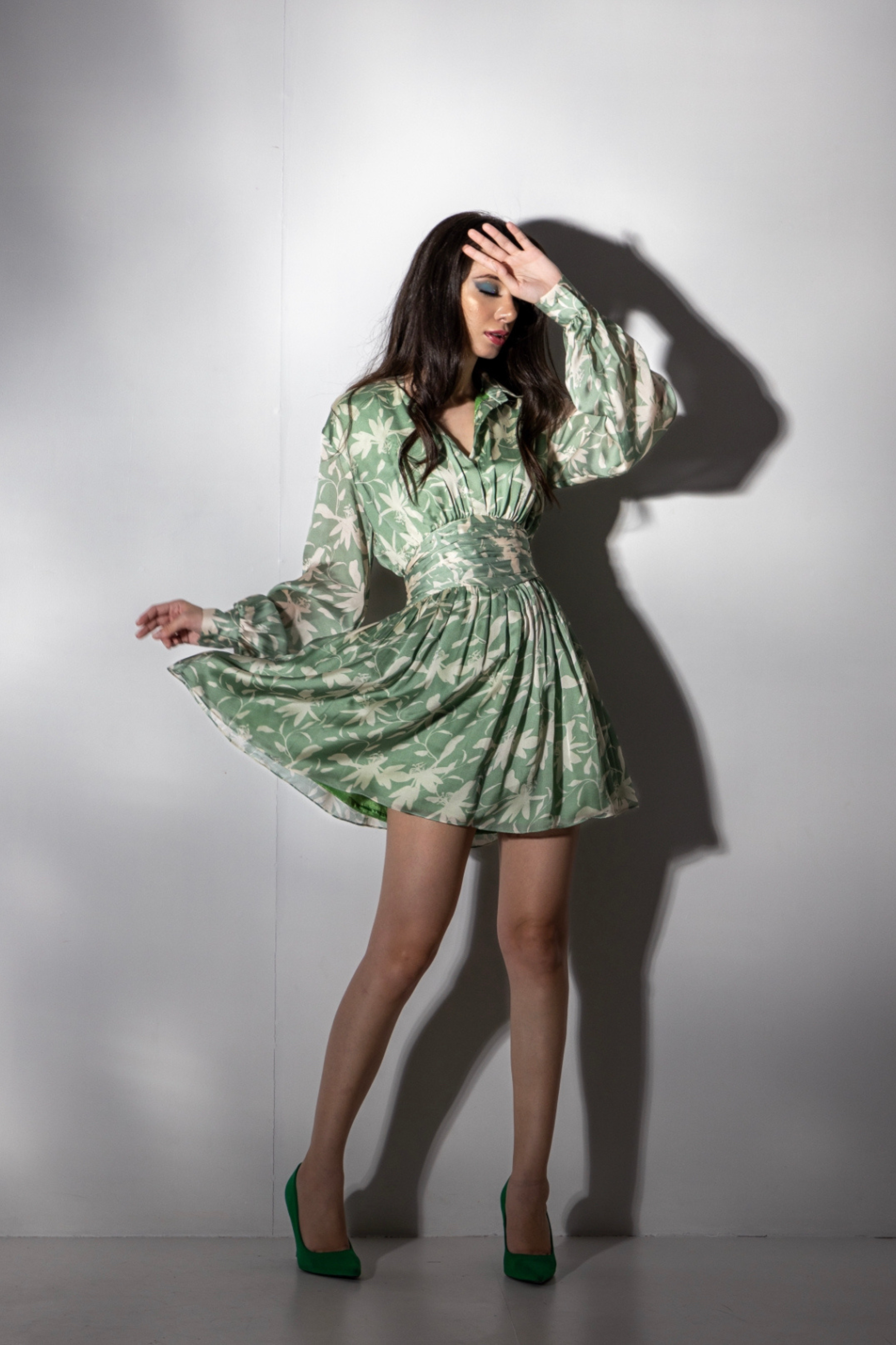 DETAIL- Printed short dress with ruched waist and gathered bottom along with open collar. Non padded and back zipper.
