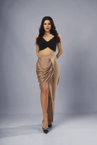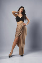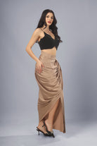 DETAIL- hand beaded padded bustier paired with gold satin draped skirt with slit.